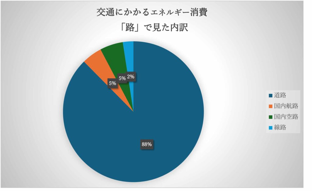 IEA様式のエネルギーバランス表の特徴は、交通のエネルギーをエネルギー種別と共に、「路」について分類していることです。路は道路、国内空路、国内海路、線路に分かれます。次のグラフで見て下さい。